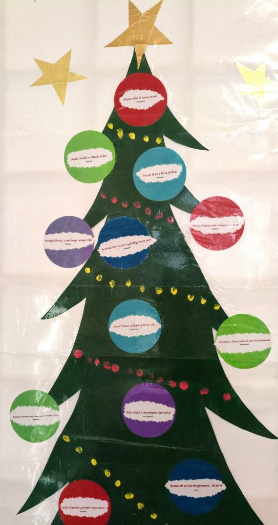 Am Vielfalt-Baum finden sich Weihnachtsgrüße in zahlreichen unterschiedlichen Sprachen. Sie spiegeln die kulturelle Vielfalt der Kita-Gemeinschaft wider und zeigen, wie selbstverständlich Verschiedenheit in der Finkenau dazugehört und wertgeschätzt wird.